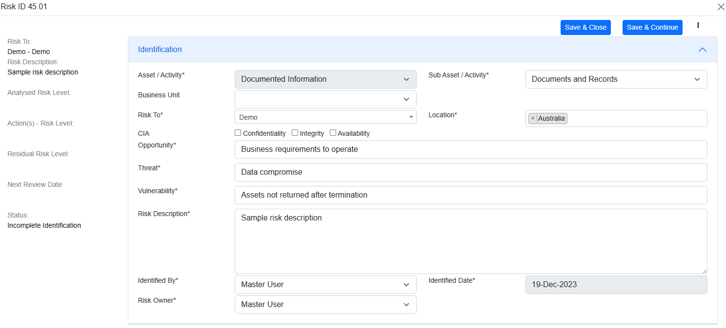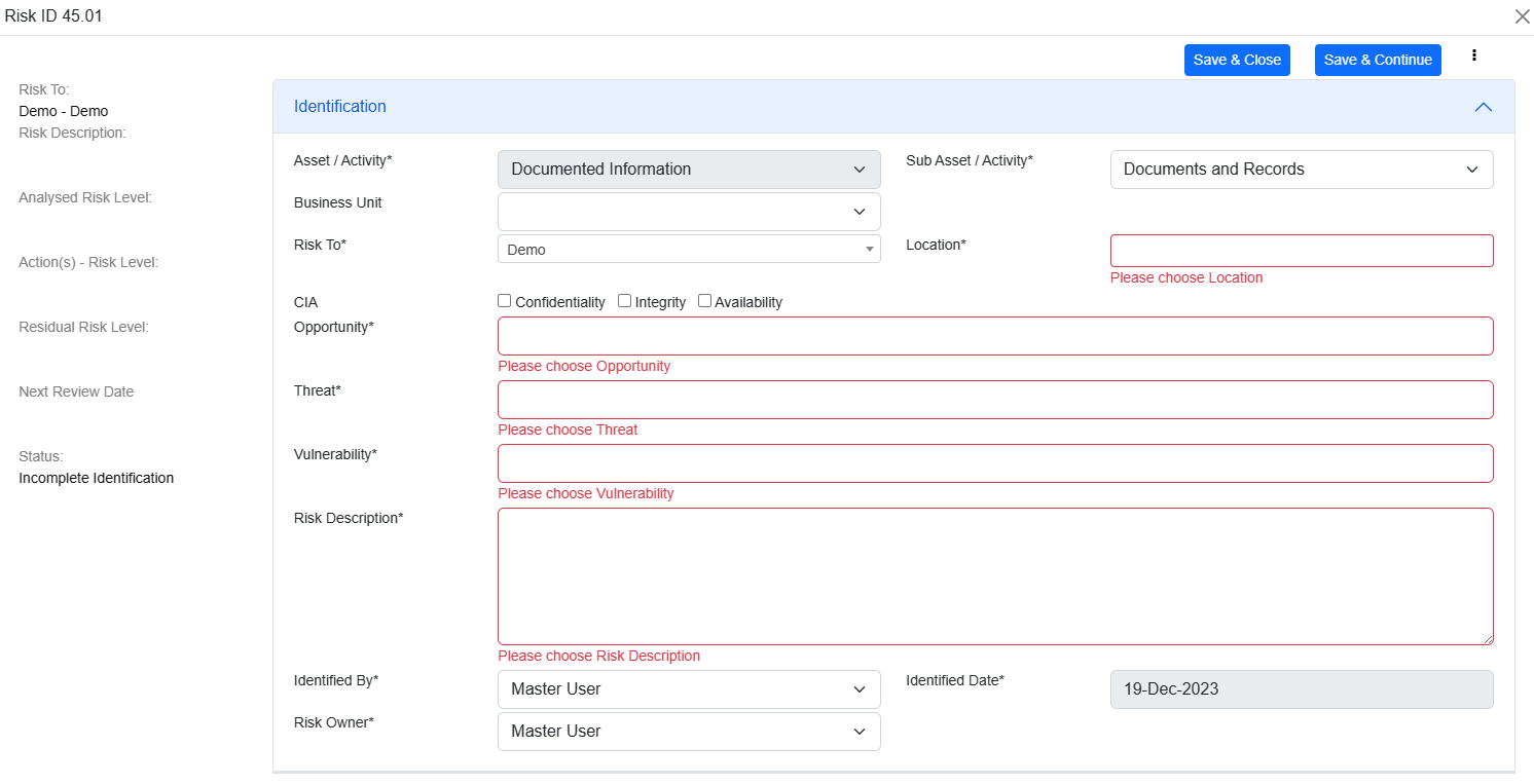 If fields e.g. Risk To, Opportunity, Threat, Vulnerability, Risk Description, Identified by or Risk Owner are left blank or removed at any stage, it will appear in this stage and highlighted.