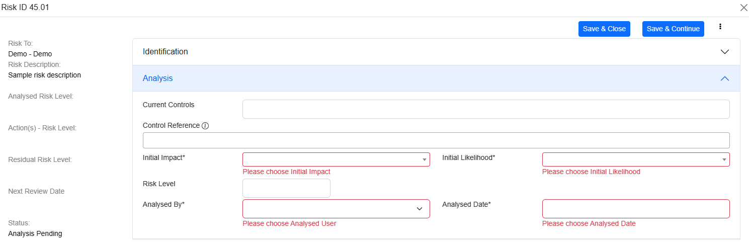 If fields like Initial Impact, Initial Likelihood, Analysed by or Analysed date are left blank or removed at any stage, it will appear in this stage and highlighted.