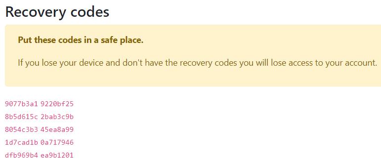 After the two factor is verified, please note down the "Recovery Codes", e.g. sample attached below.