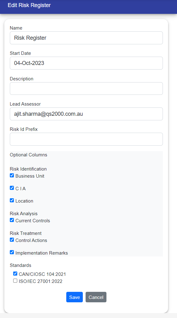 Click on create new risk register to create a new risk register.