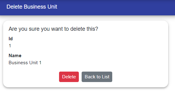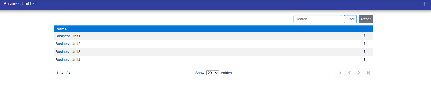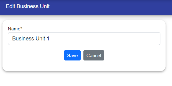 Business Unit has list, create, edit, delete functionality.