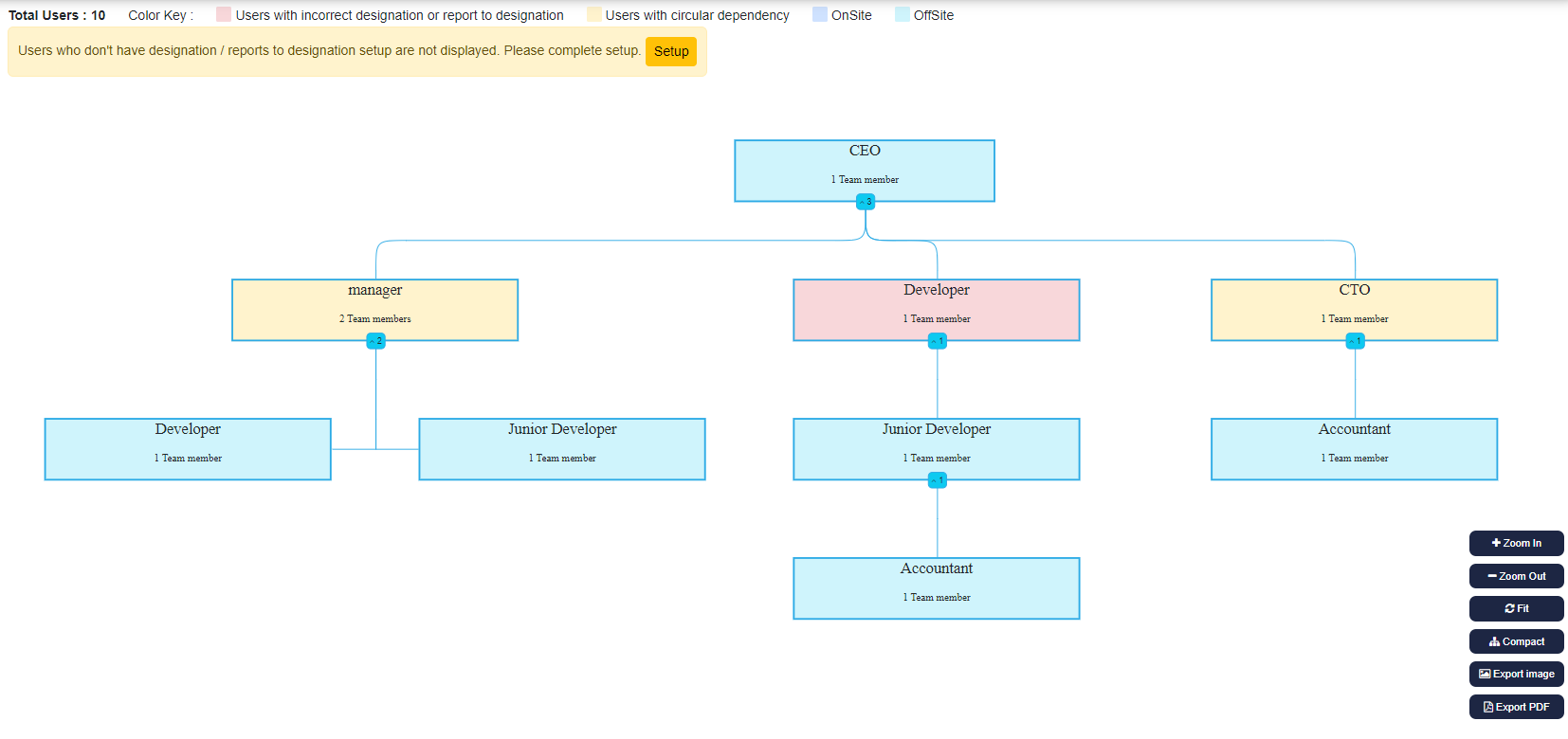 If admin or manager haven't defined their respective designations or reports to designations, then simply click on the 'Setup' button to assign users to their respective supervisors.