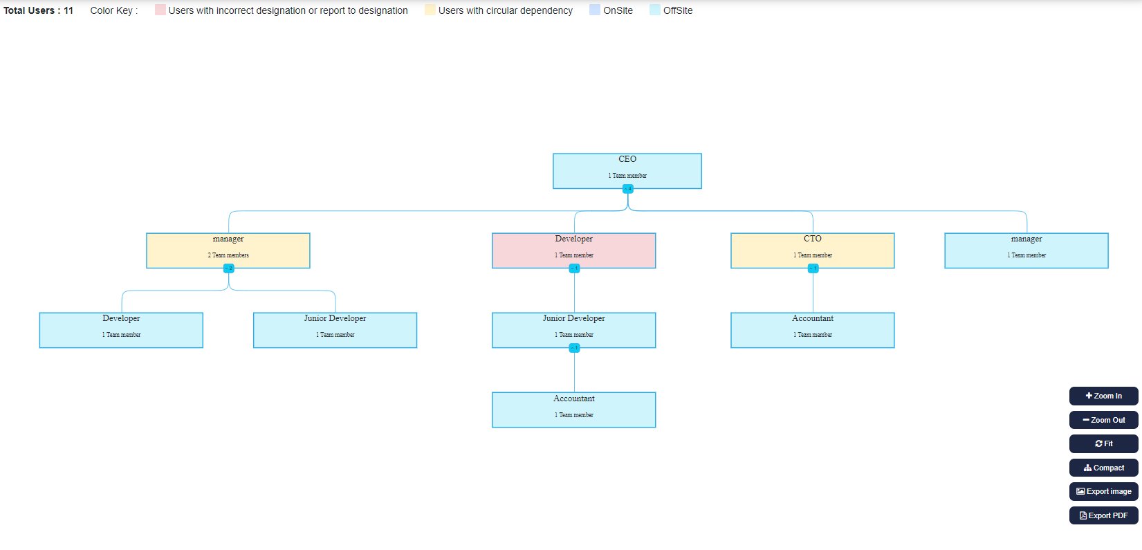 In the organisation chart without Names (Designation), It displays only the designation of each user who works under a specific manager and specifies each number of users reporting to that designation. This helps to provide a clear understanding of the reporting structure and hierarchy within the organisation, without displaying detailed information about each individual user.