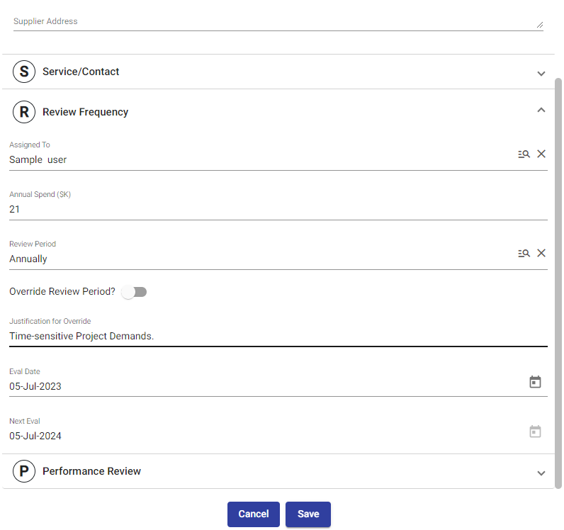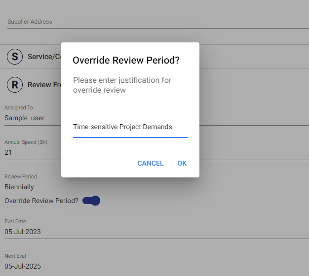 When entering the Annual spend, the review frequency is automatically set based on that value. However, if you wish to change it, you can check the "Override Review Period" option. This will prompt a popup where you will need to provide a reason for the change.