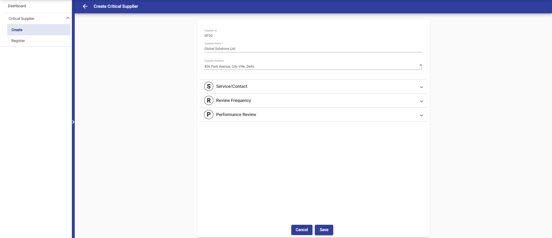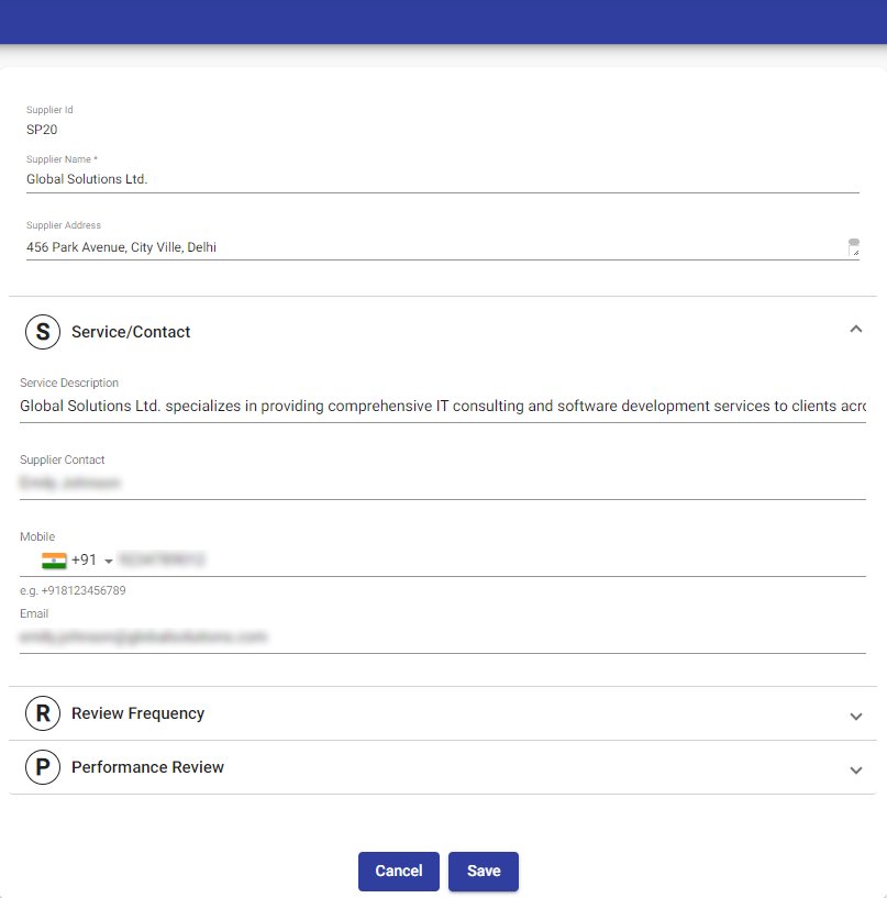 In the Service/Contact section, you can enter contact-related information such as service description, supplier contact, mobile number, and email. The supplier contact refers to the user who maintains contact with the supplier for communication purposes.
