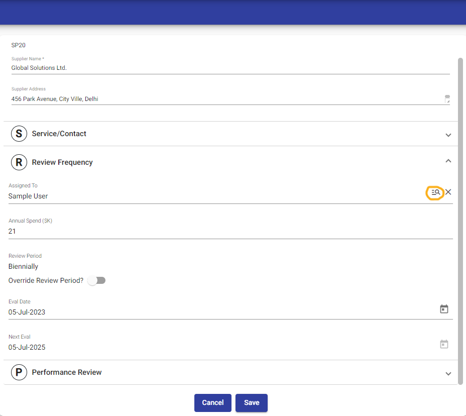 When you change the review frequency, the evaluation dates are auto-populated. This ensures that the evaluation dates align with the updated review frequency for the supplier.
