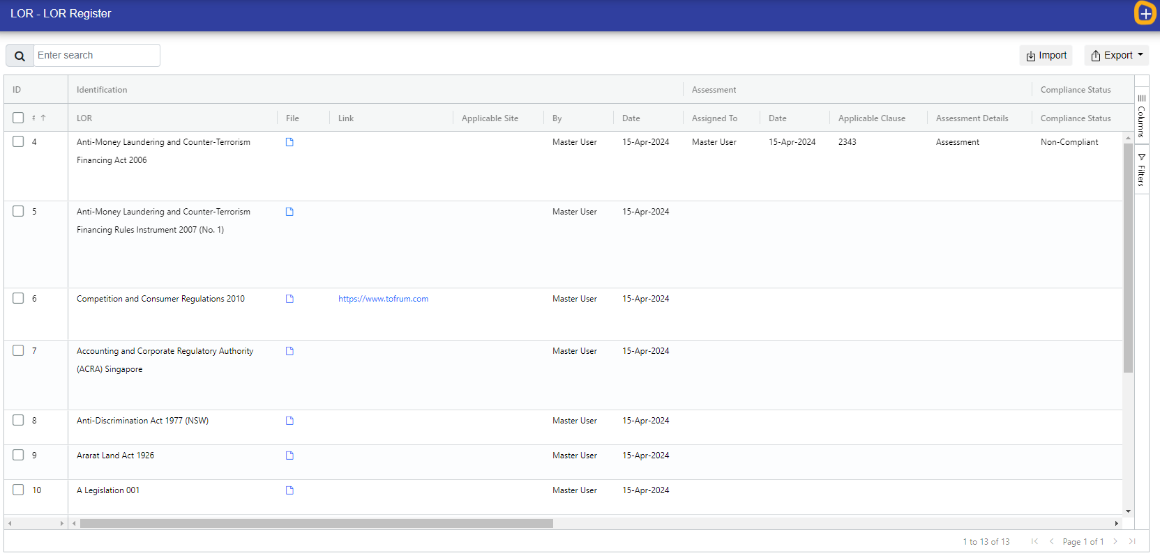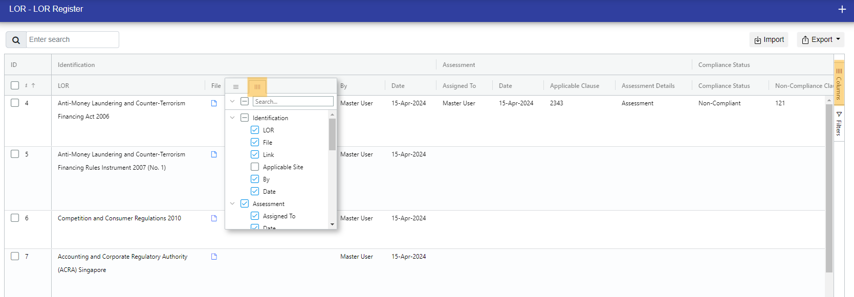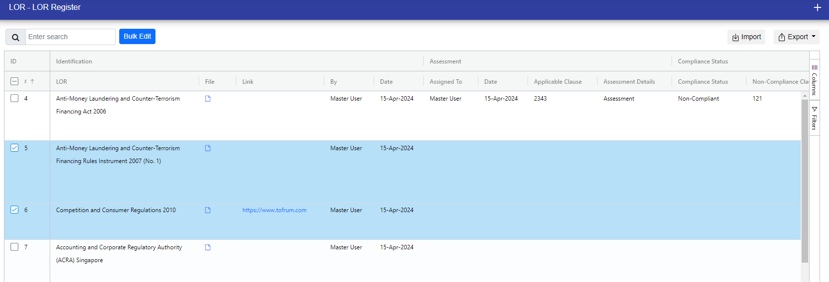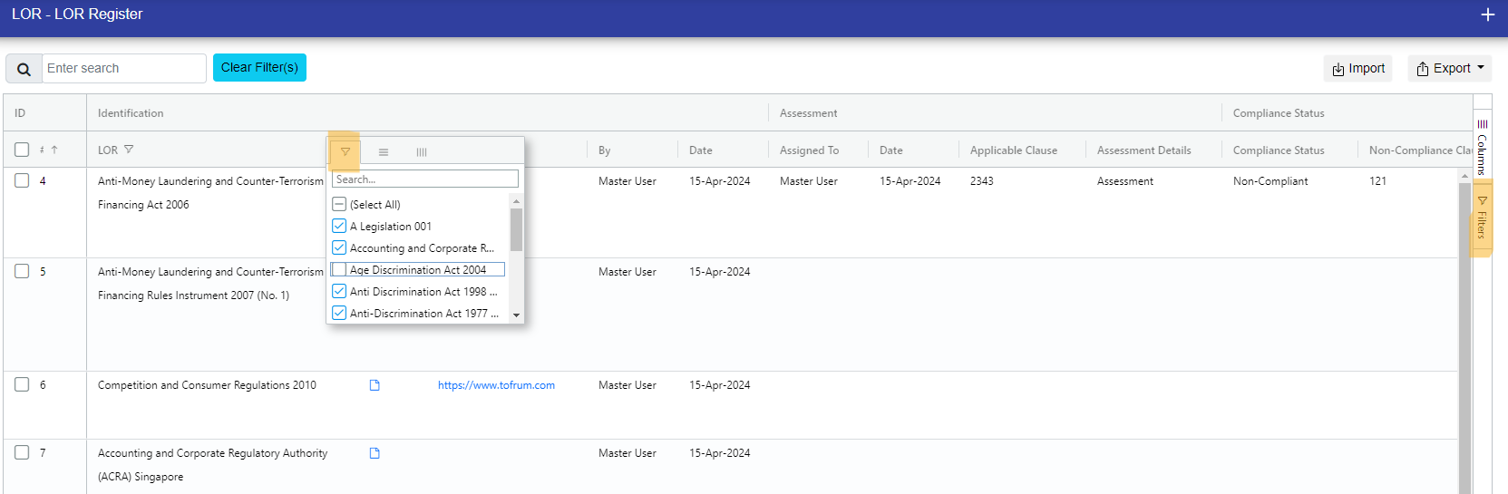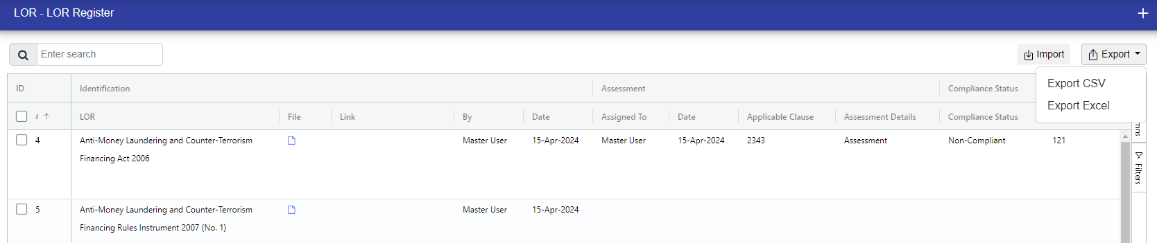 In the LOR register, you can see all of the LORs. Additionally, you can apply filters to view them according to specific requirements.