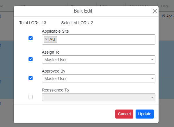 Step 1: Click the checkbox to select the LOR you want to update.