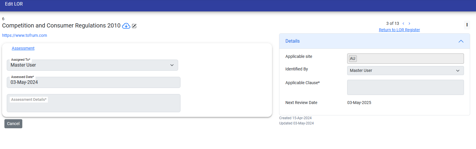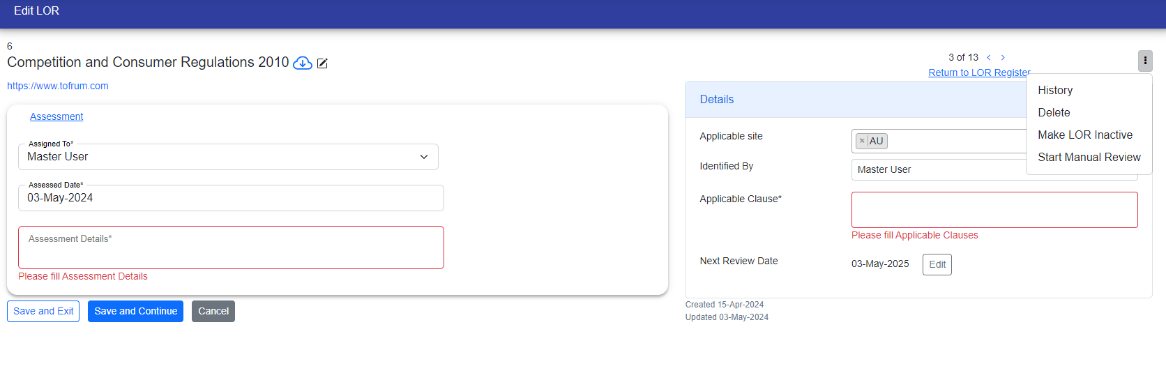 Note : Only LOR manager can perfrom operations like - Edit, Assign a User to LOR, Manual Review the LOR, Active/Inactive the LOR and Delete the LOR.