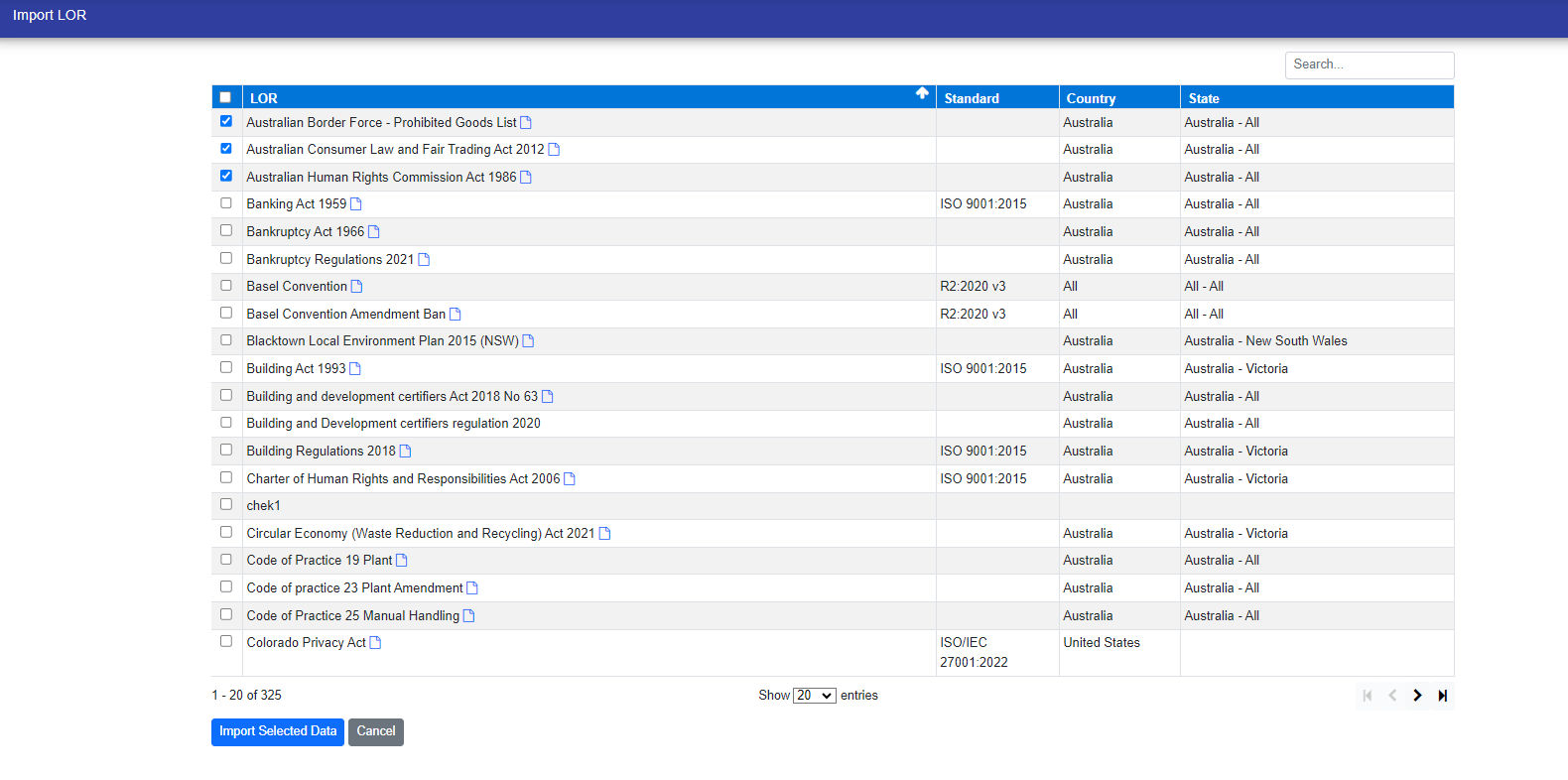 After clicking the "Import" button, you can see the list of LORs where you can select the LORs and click on "Import Selected Data" button to import them into your register.