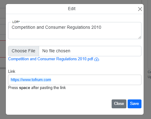 By clicking the edit icon located on the right side of the Legislation name, the LOR assignee can directly edit the Legislation name, file, and link.