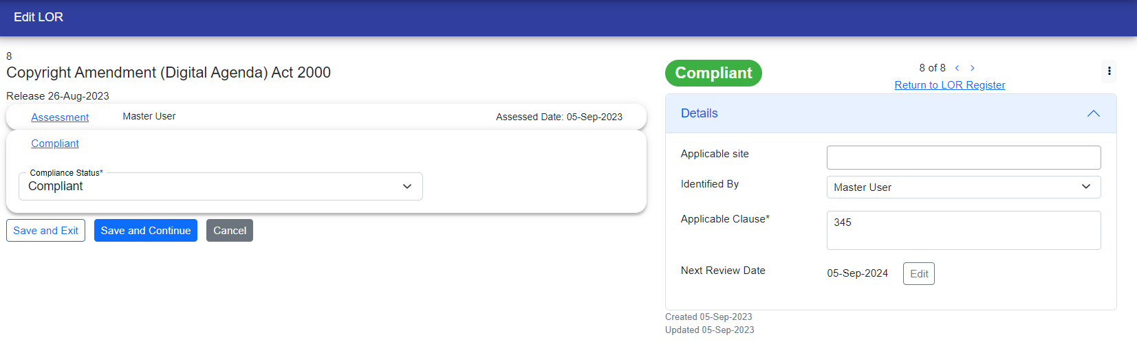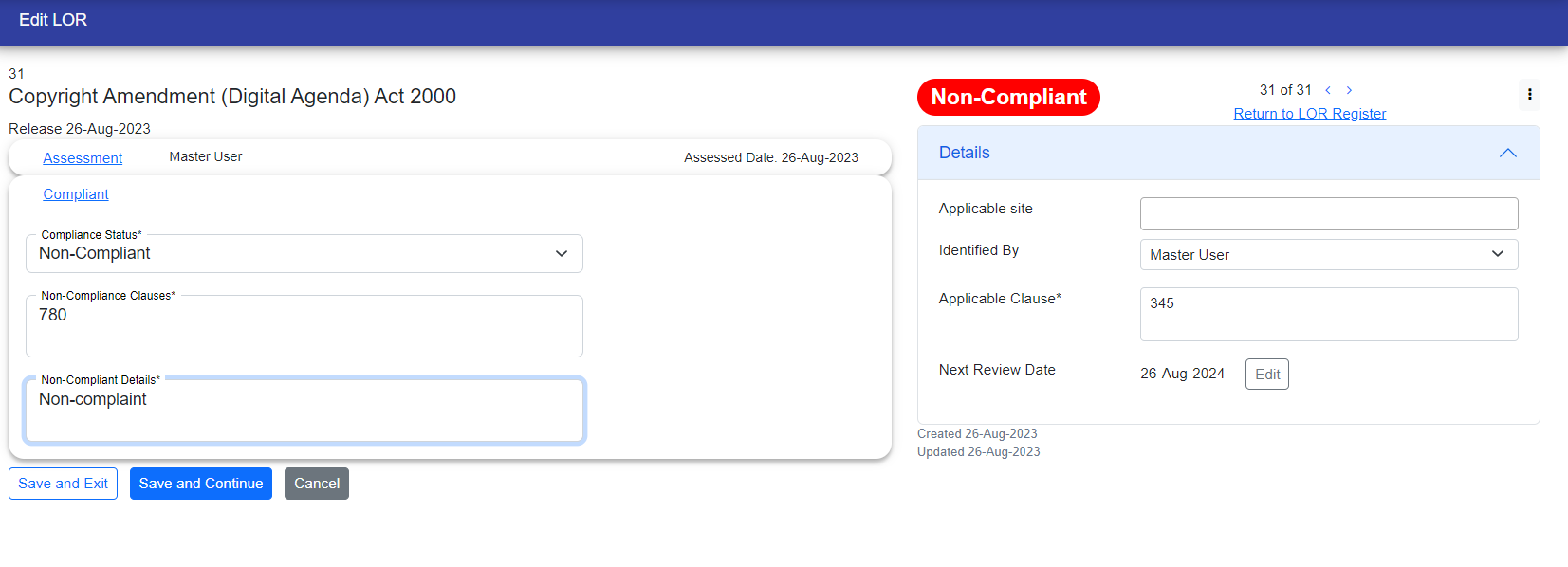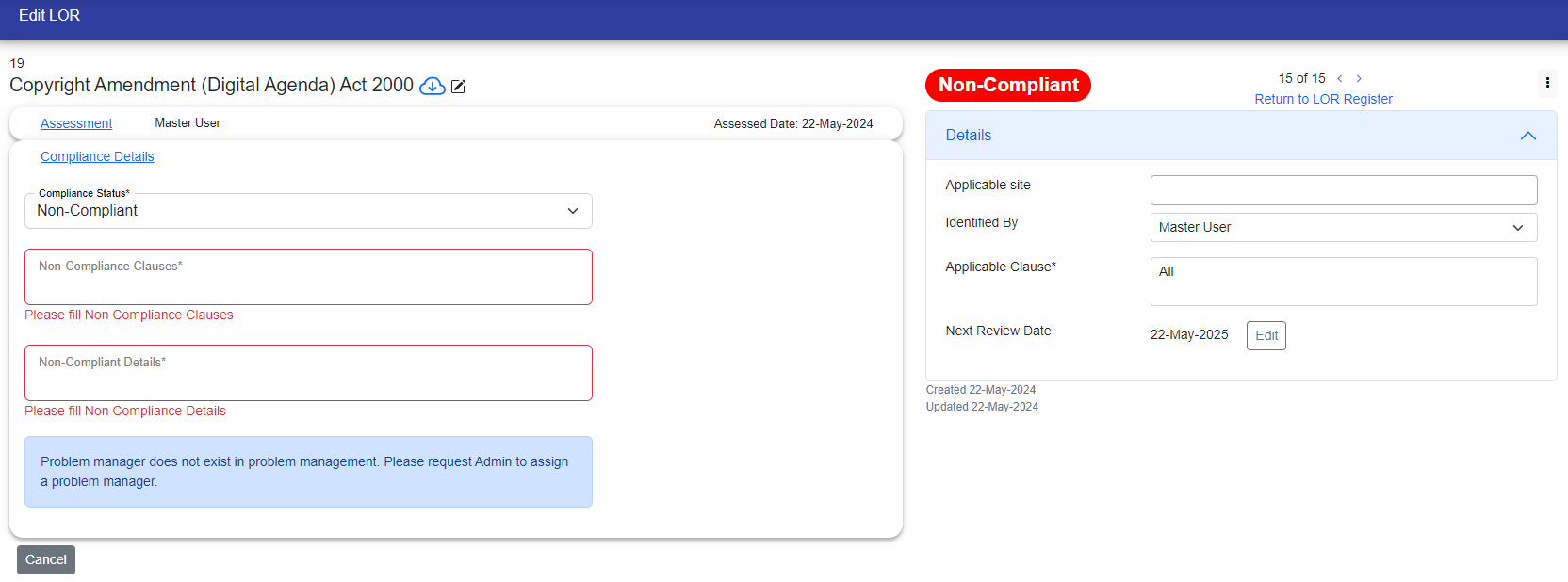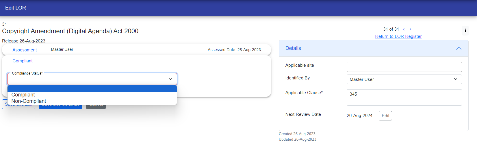 If the LOR is compliant, its status will be displayed in green color in the upper right corner. If it is non-compliant, the status will appear in red color in the same location.