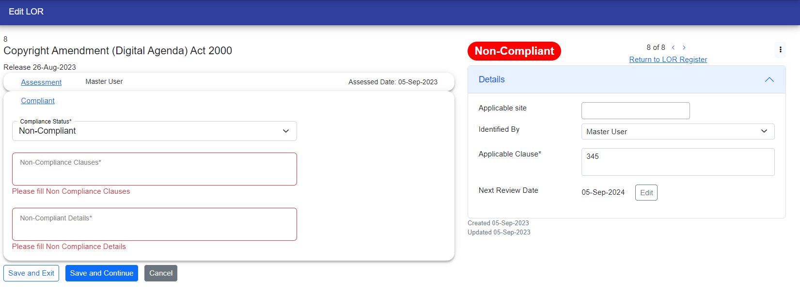 Once the non-compliance status is filled out, the user will encounter required fields marked with a red border. Alongside these fields, there will be a message indicating that they must be filled out before continuing.