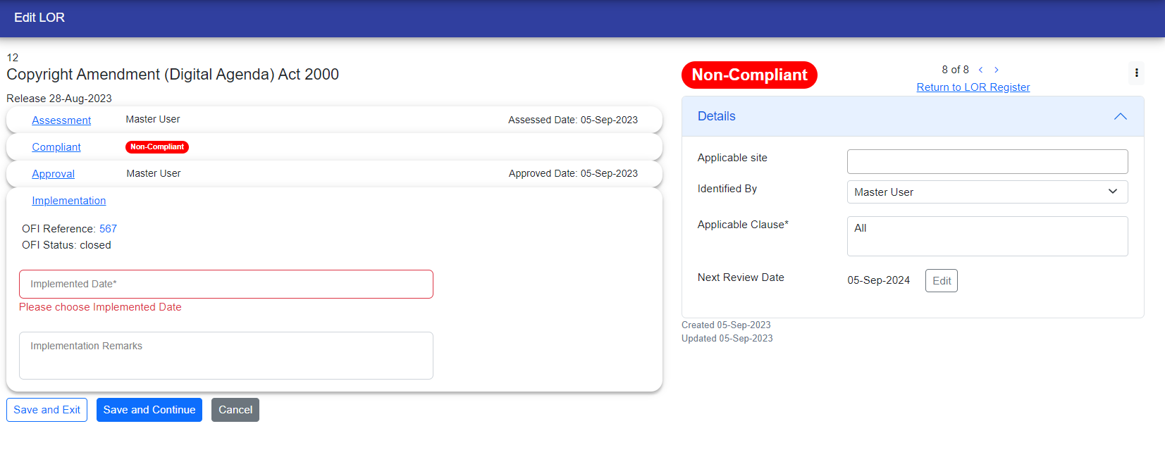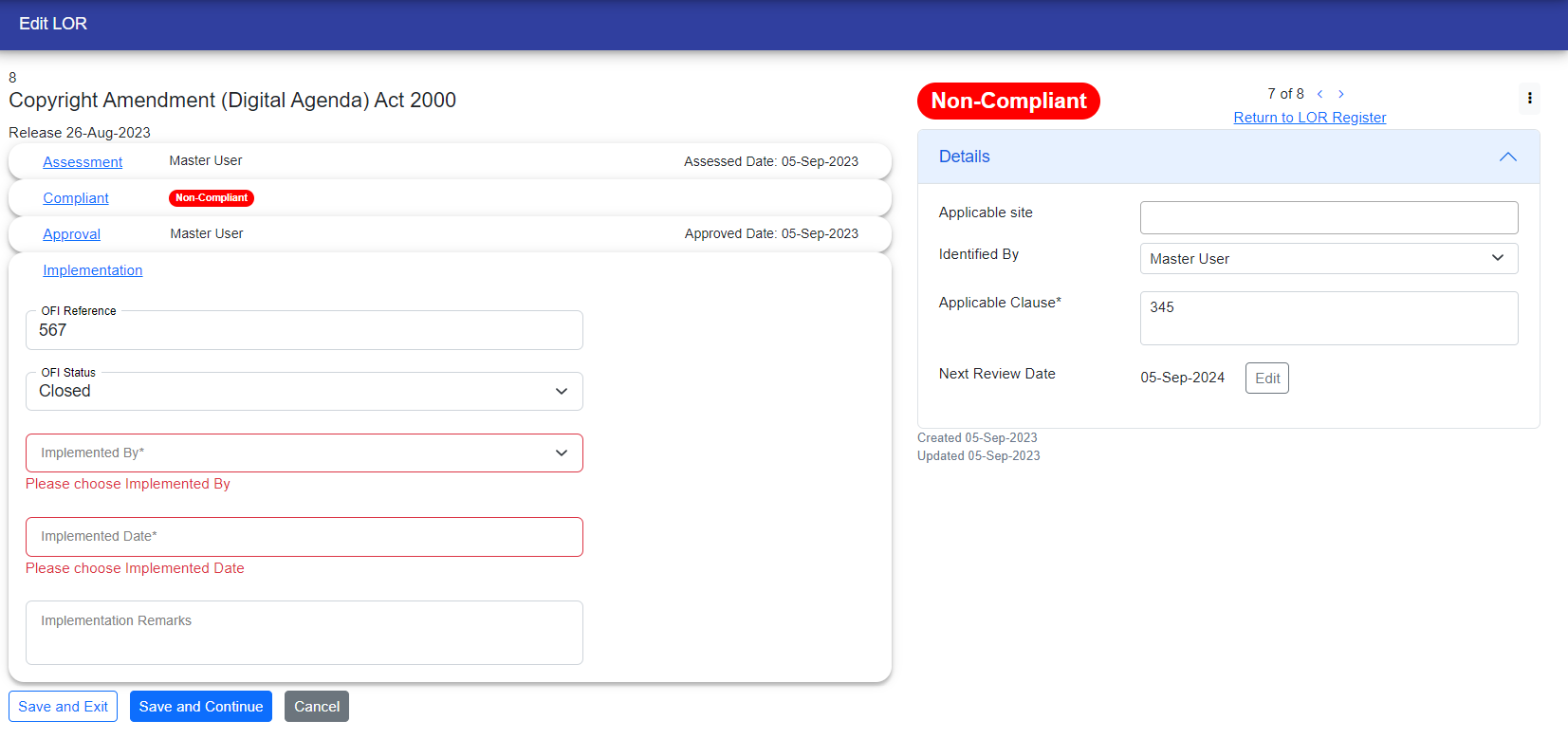 After chosing the close you have to fill out the required fields that is "Implemented By" and "Implemented Date" which appear with red border and with some messages.