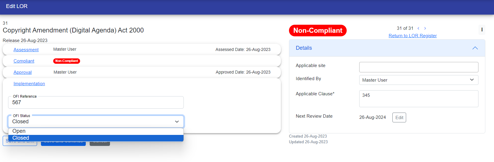 During the implementation stage, you need to provide OFI references and choose the status for OFI. If you select "open," the OFI is in working. However, if you choose "close," you must enter the next steps.