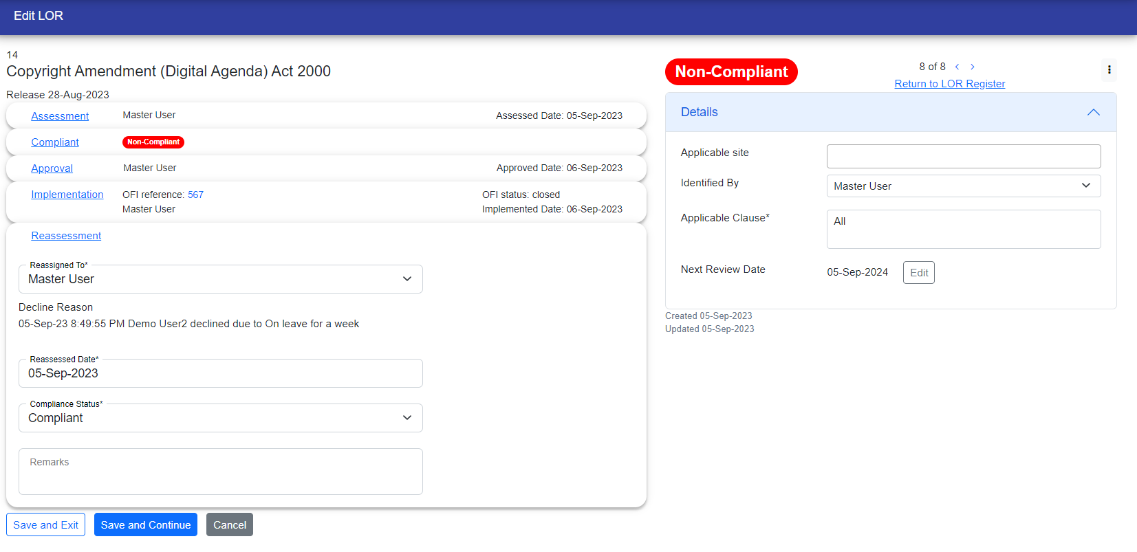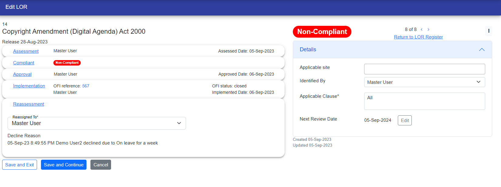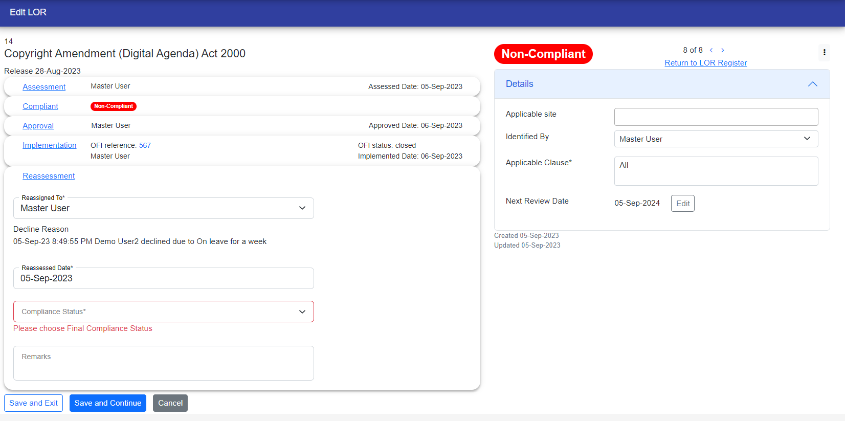 If user Accepts the LOR then he/she can work further and after acception LOR User have to fill out the required fields that is "Reassessed Date" and "Compliance Status" that appears with red border.