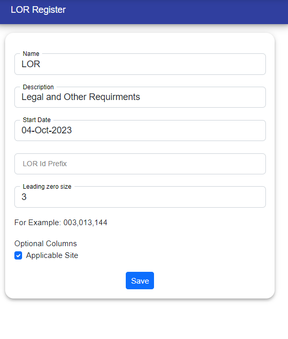 In the LOR register page, the manager can make changes to some fields. They can edit the LOR's Name, Description, Start Date and adjust settings like "ID Prefixes" and "leading zero Size" fields. This helps them decide how they want LOR IDs to look, and there's an example of LOR ID's shown at the bottom of the last column.