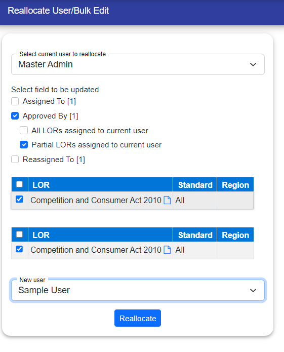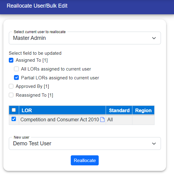 When you want to relocate the LOR responsibility of a user to another user due to some reasons then you can do it from this page.