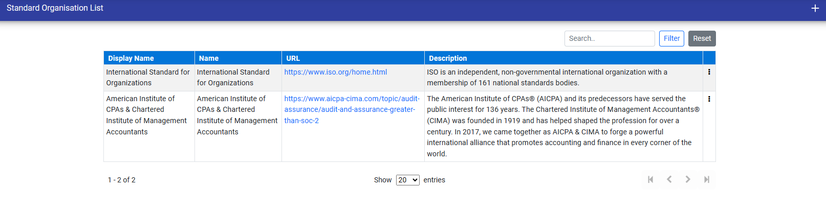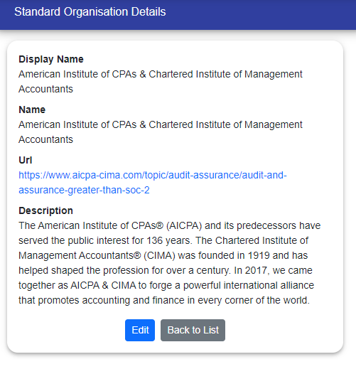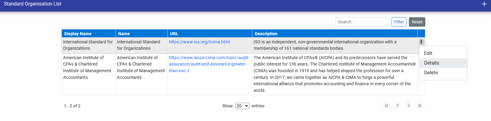 You can also perform operations like Create, Edit, Delete and can also view the details of the standard organisation by click on three dots in the last column of standard.