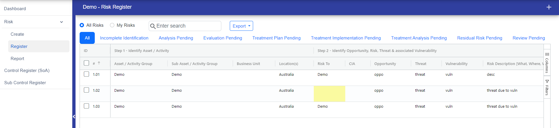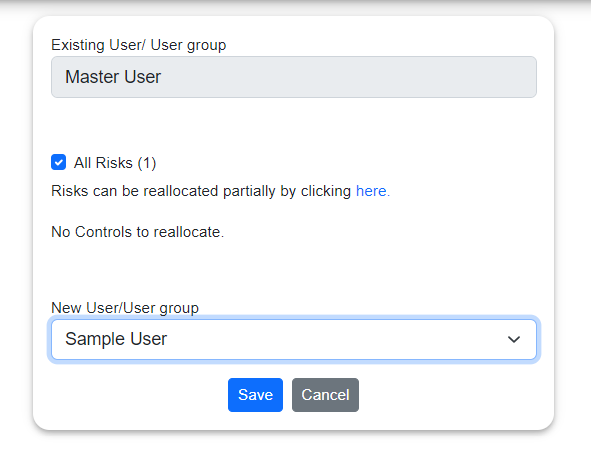If you want to partially reallocate User/Usergroup then click on "here" and you will redirect to risk register page where you can choose the risk to reallocate the User/Usergroup.