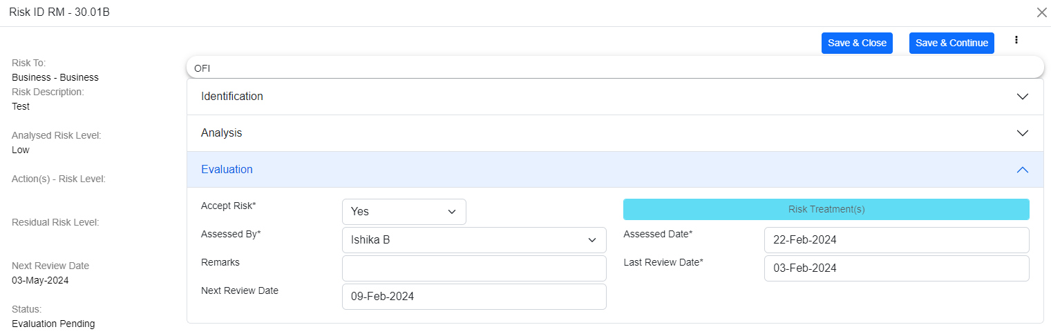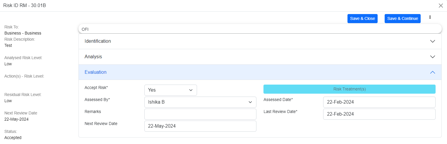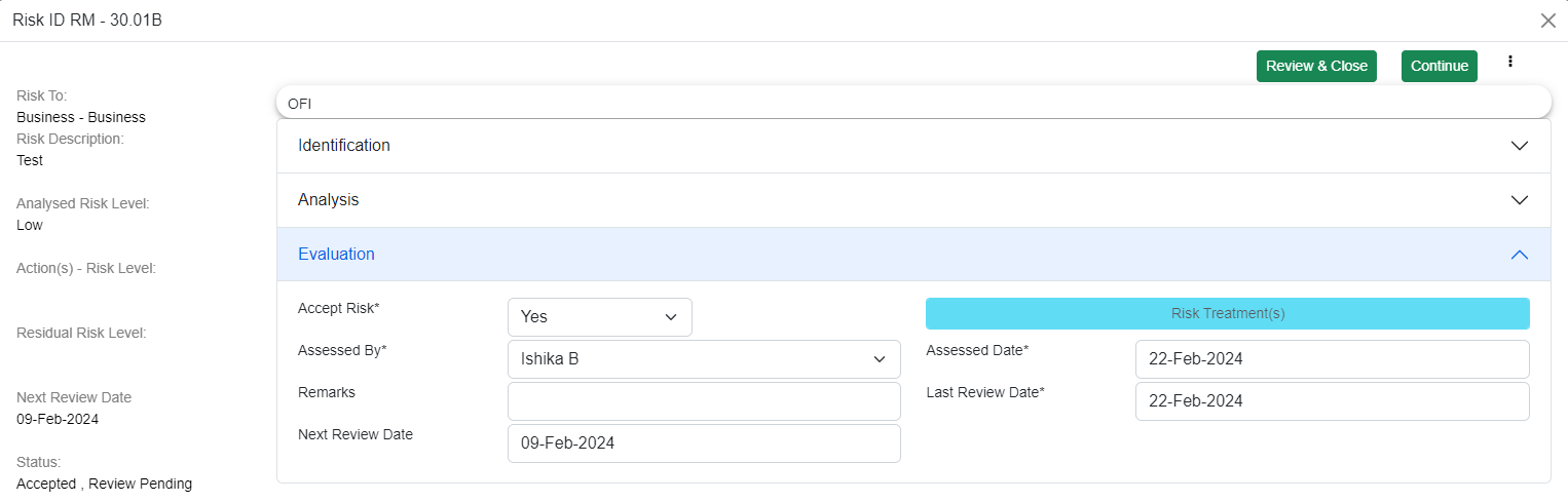 If you click on "Review and Close", then the risk is reviewed and it will be moved from the review pending stage, the last review date is updated to the current date, and the next review date is scheduled based on the review frequency.