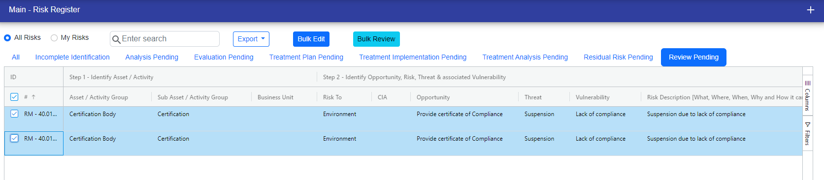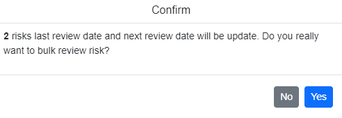 Additionally, you can bulk review risks. After selecting the risks and clicking on "bulk review," a popup will appear indicating that the last review date and next review date will be updated accordingly.