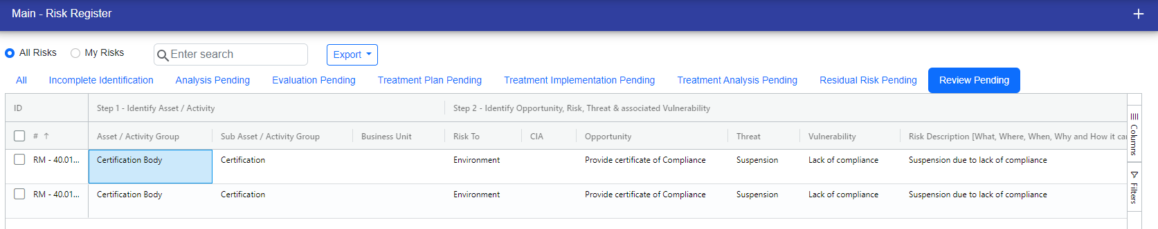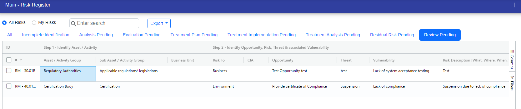 When we accept a risk next review date can be scheduled automatically based on the review frequency, or we can set it manually if needed. If the scheduled dates are within 7 days, the risk moves to the "Review Pending" stage.