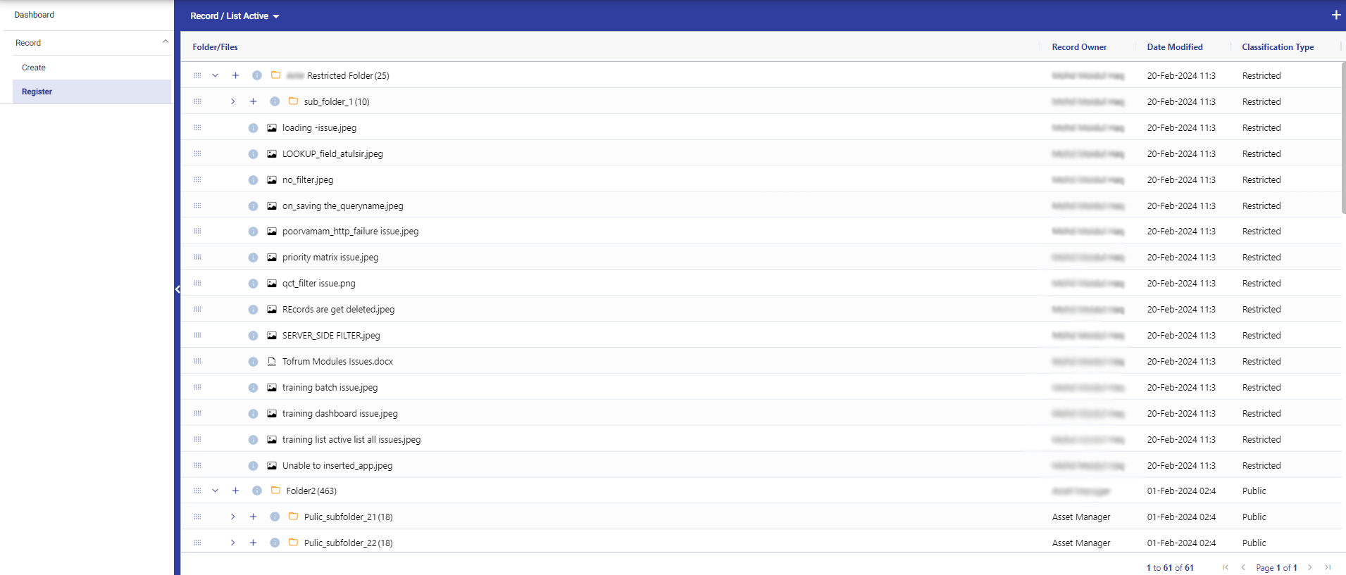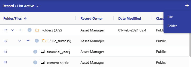 In the record register, you can view all the records, including folders, their subfolders, and files that you've created. Additionally, you can perform various operations such as viewing, adding new folders/files, or deleting them.